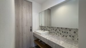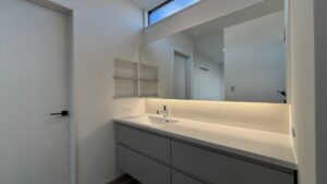 一面鏡を使用していますが、間接照明を入れるため、鏡裏の壁をふかしています✨