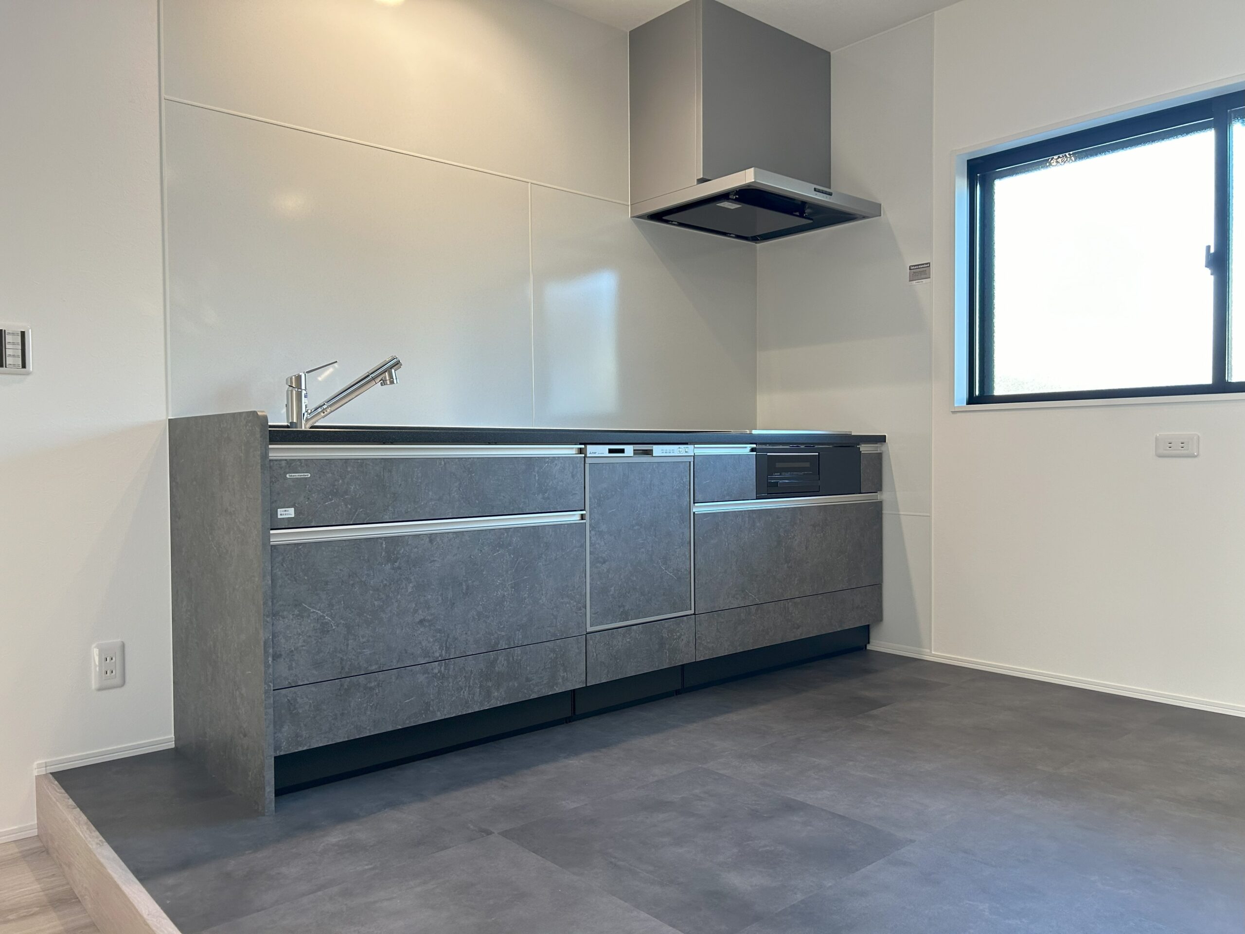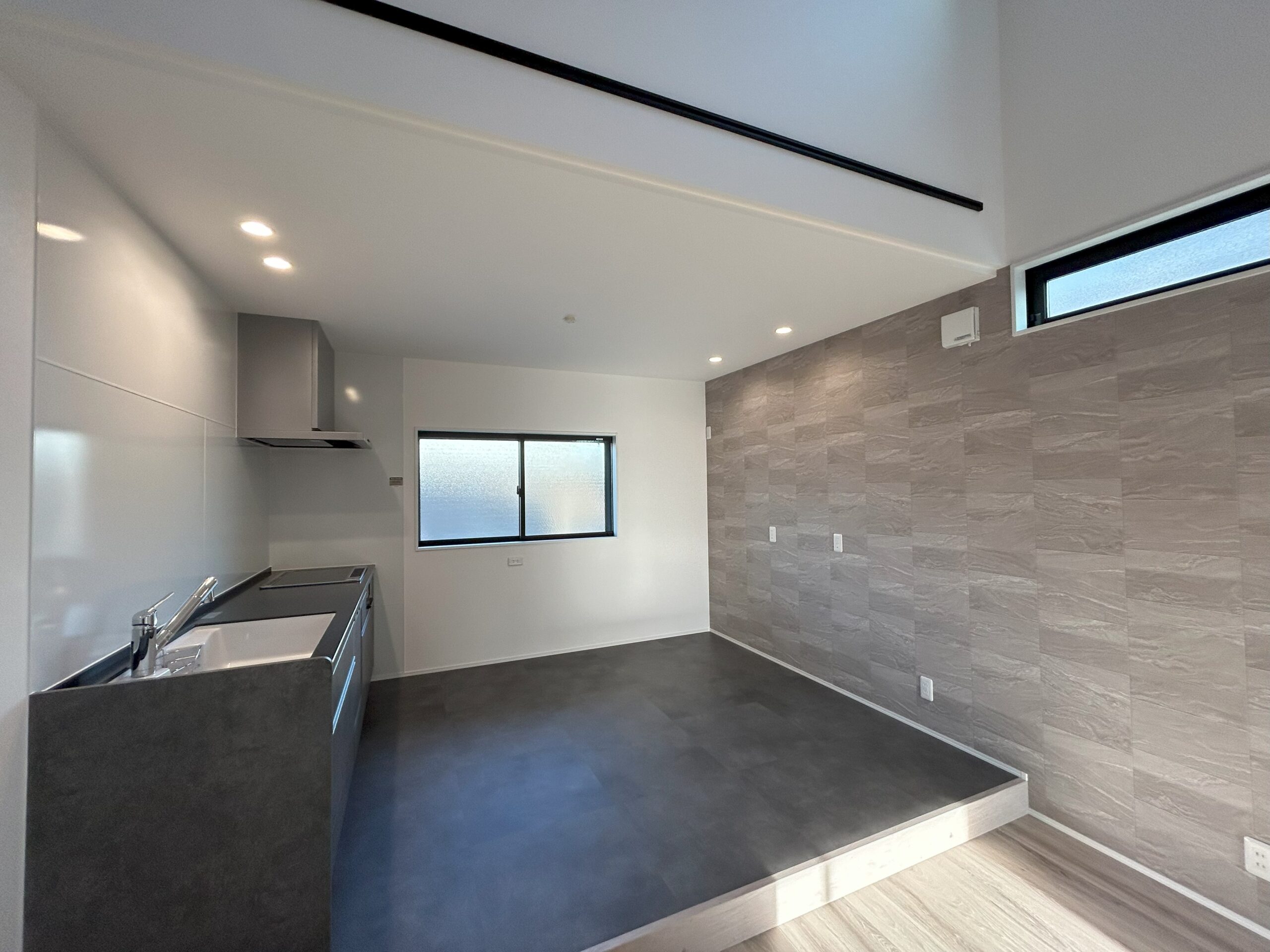 キッチンダイニングスペースは1段子上がりを造作し、フロアタイルを施工しました。