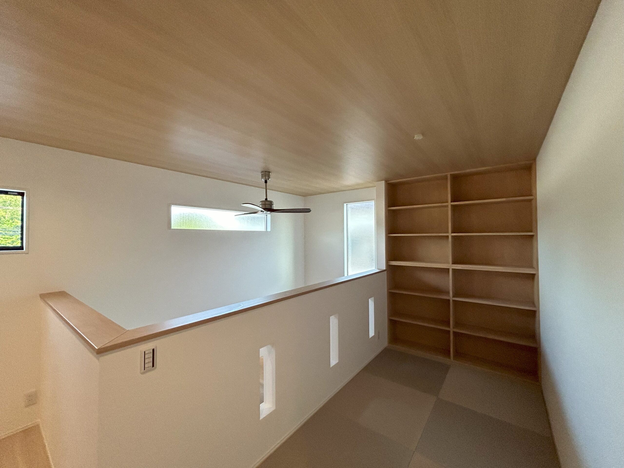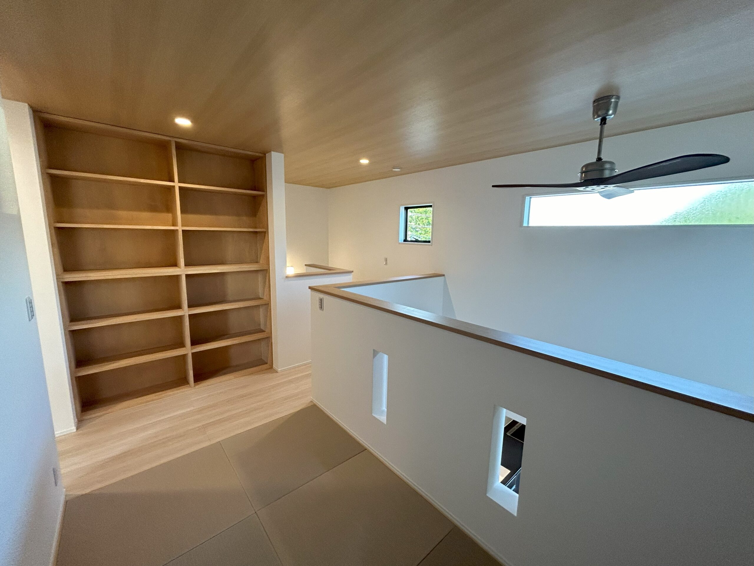 2階の畳スペースには床から天井までの造作本棚を施工しました。