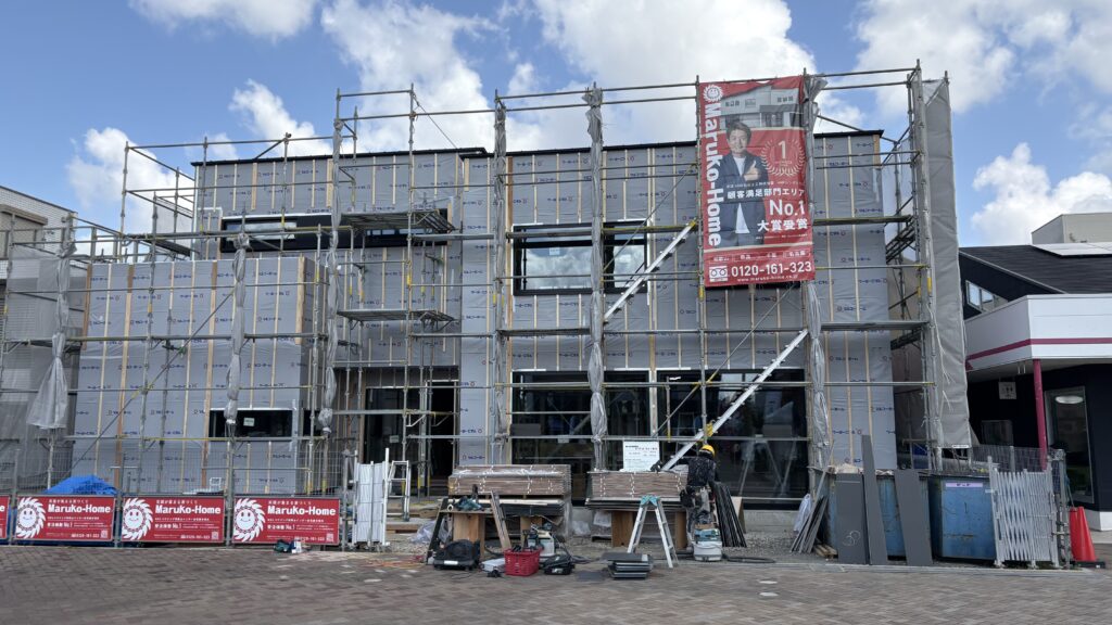外壁の施工は建物のうしろ側からスタートし、翌朝にはここまで仕上がりました。一部まだ未施工の部分もありますが、どんなデザインのサイディングが張られるのか、ぜひ完成をお楽しみに!