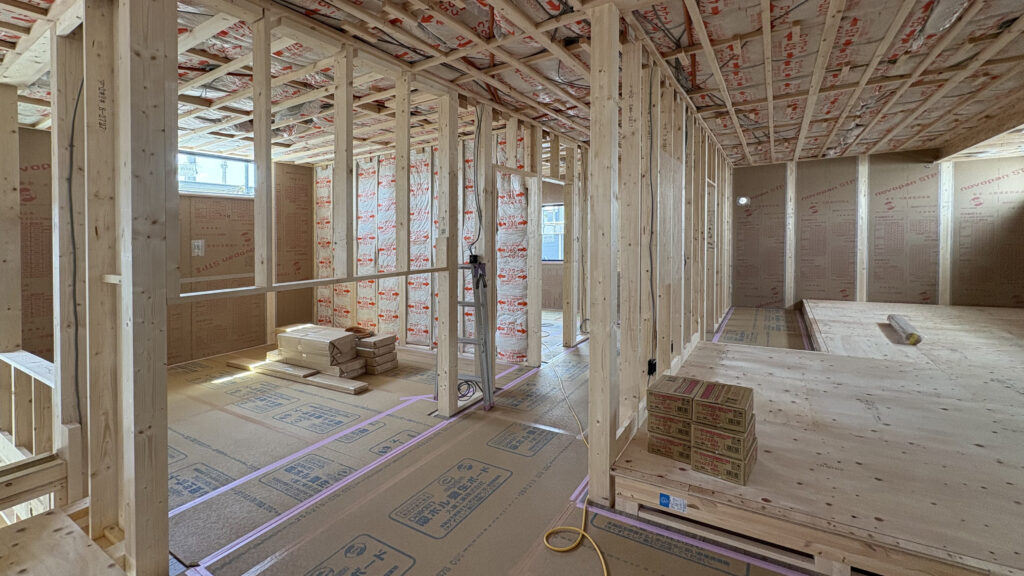 外部の工事と並行して、内部の大工工事も着々と進行中です。天井や一部の内壁には断熱・防音効果のあるロックウールを敷き込み、構造用耐力面材には「ノボパン」を使用。構造用耐力面材は、地震や台風に強い、安心の住まいづくりを支える大切な建築資材です。
