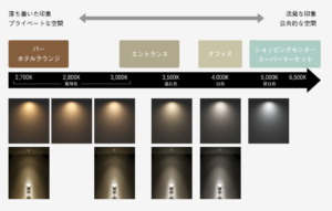光の色には、青みがかったものから黄みがかった光がありますが、これらは空間の雰囲気に大きく関係しております。