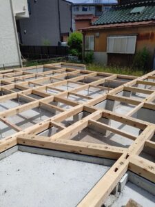 写真は土台といわれる建物の柱が立つ前の段階の状態の写真になります。この状態から一気に進めていきます。