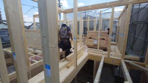 まず初めに柱を立て、2階の床及び建物を支える梁を組んでいきます!