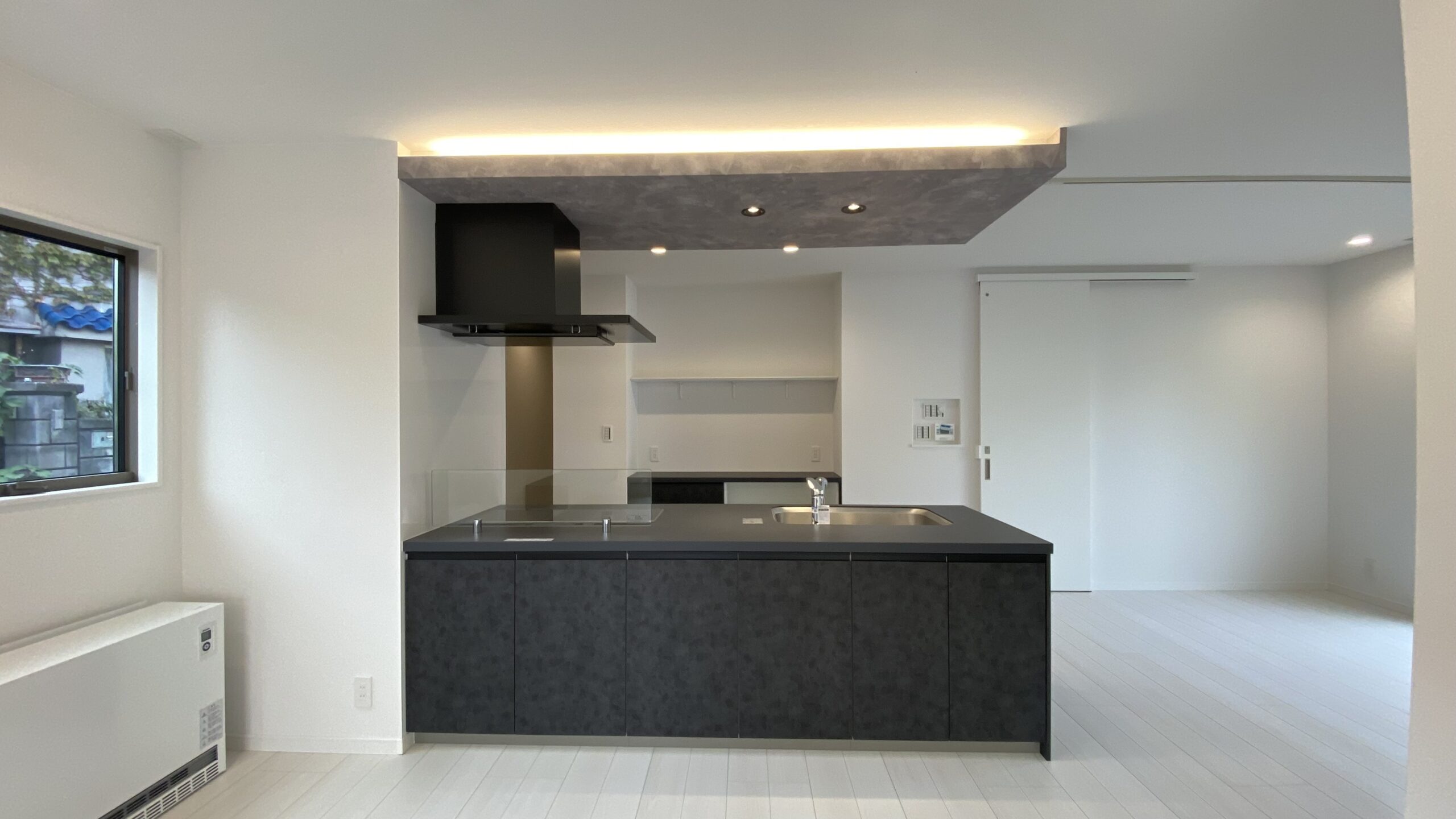 床やカウンターなどは明るい木目カラーで統一され明るさも保ちつつ、寝室という事で、建具や窓枠などはブラックカラーで引き締める事で少し落ち着いた印象にも。
