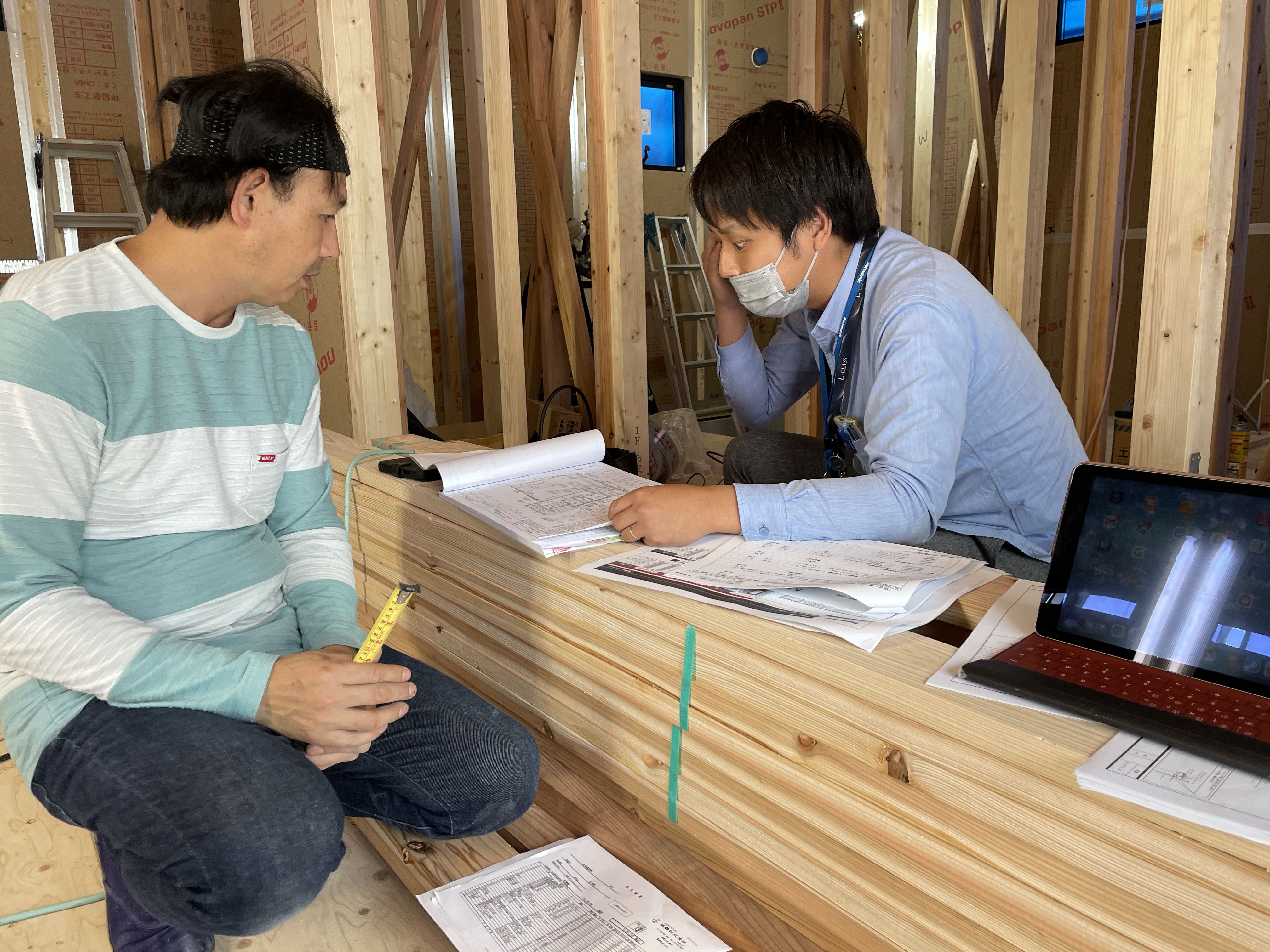 建具の納まりや、開口寸法の確認など現場の大工さんと直接打合せを行って来ました。