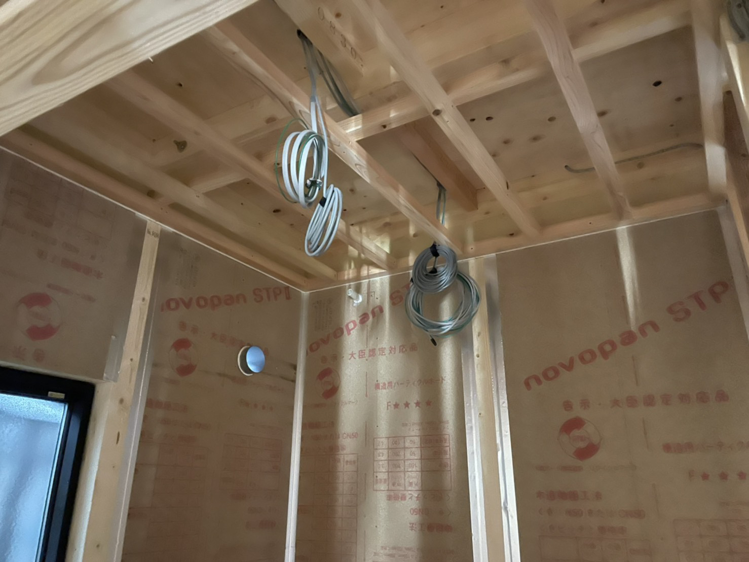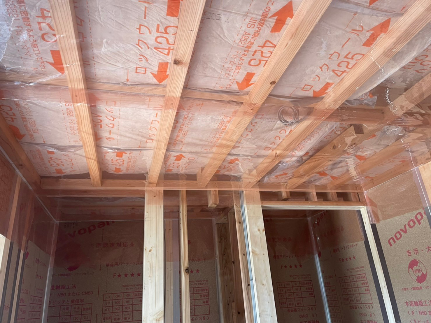 2階の天井の写真ですが、断熱材の下に気密シートを貼っています。この気密シートを貼ることにより2階の天井から屋根裏に空気が漏れないように天井の気密を上げるよう施工しています。