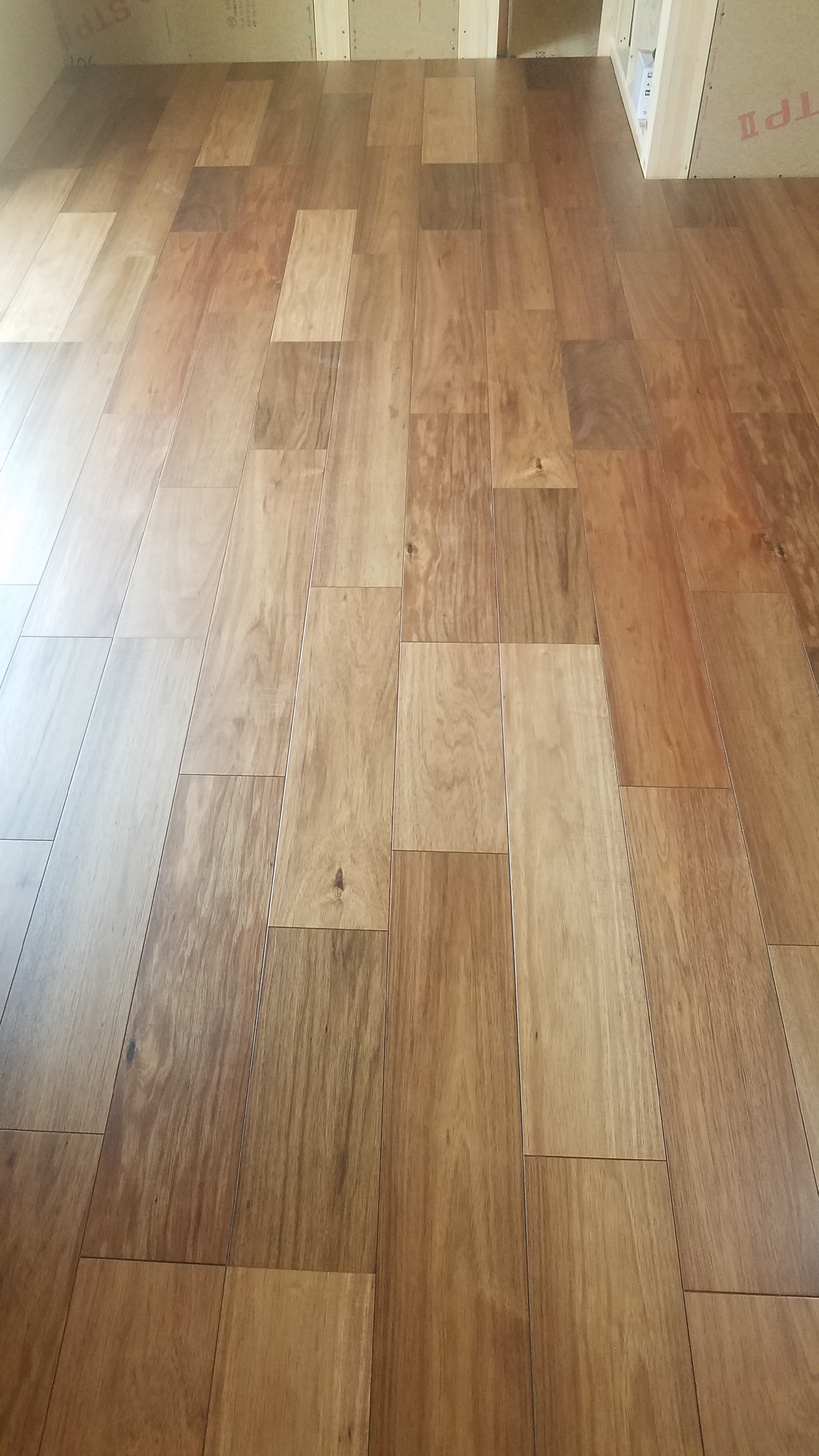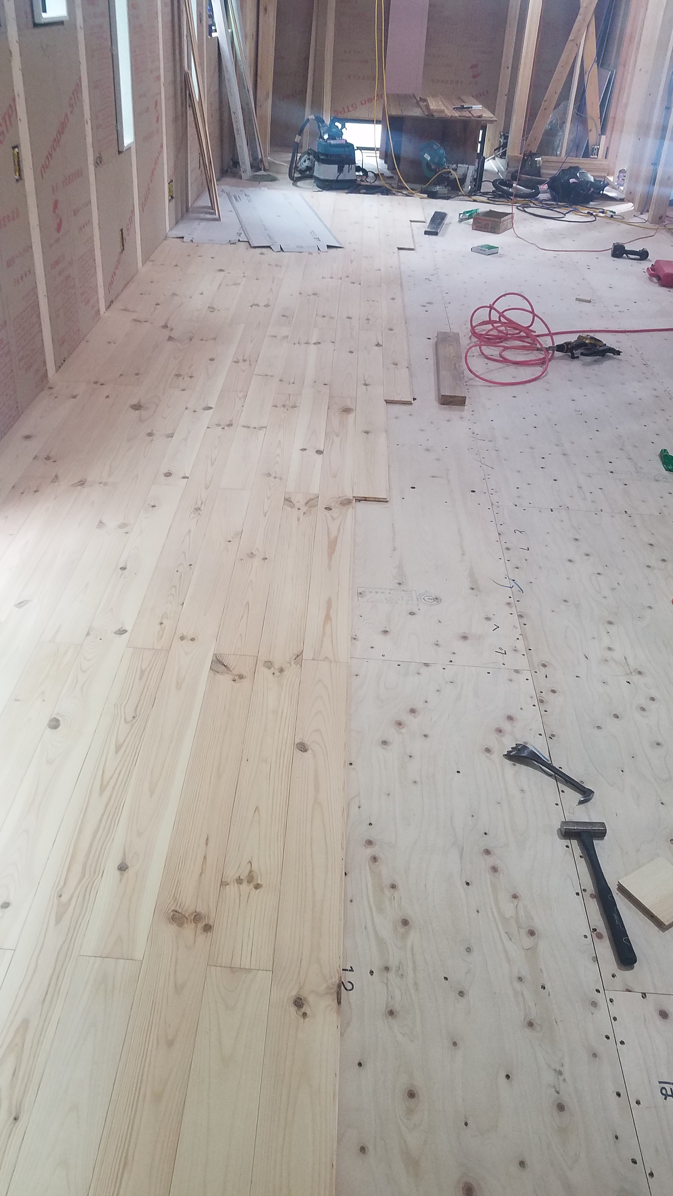 途中ではございますが、こちらが本物の木を使用した無垢床となっております。