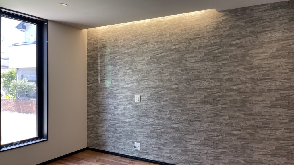 リビングにはアクセントとして、壁一面にタイル調のクロスを施工。