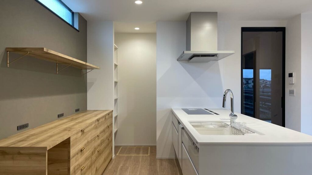 キッチン本体はホワイト一色でシンプルに、カップボードには