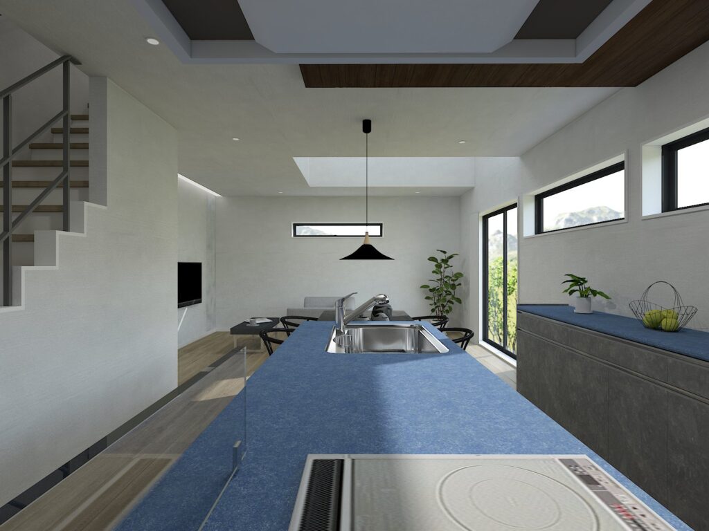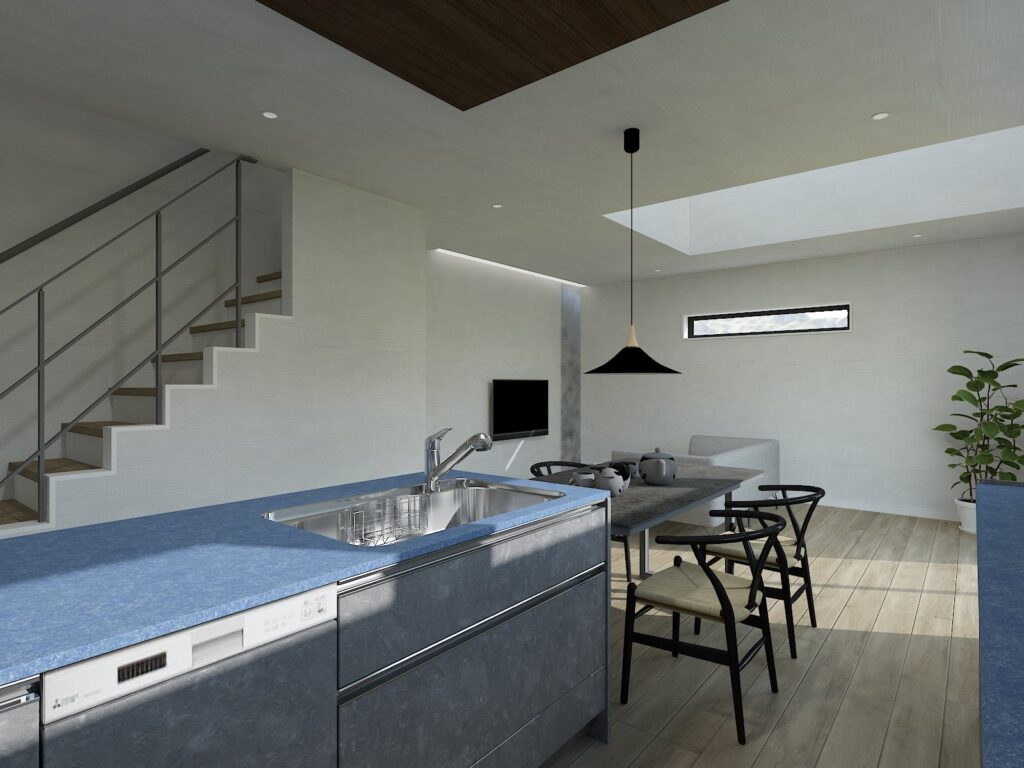 ▼横並びのキッチン&ダイニング&リビングで、家事も会話もスムーズに。