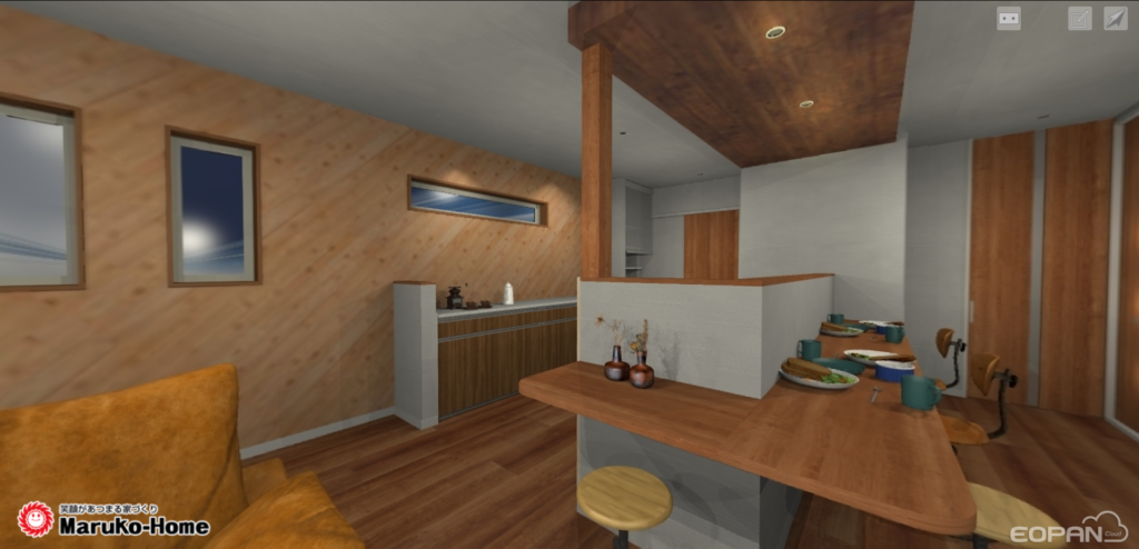 📌キッチン前の腰壁にはダイニングテーブルを兼ねた広めのカウンター設置