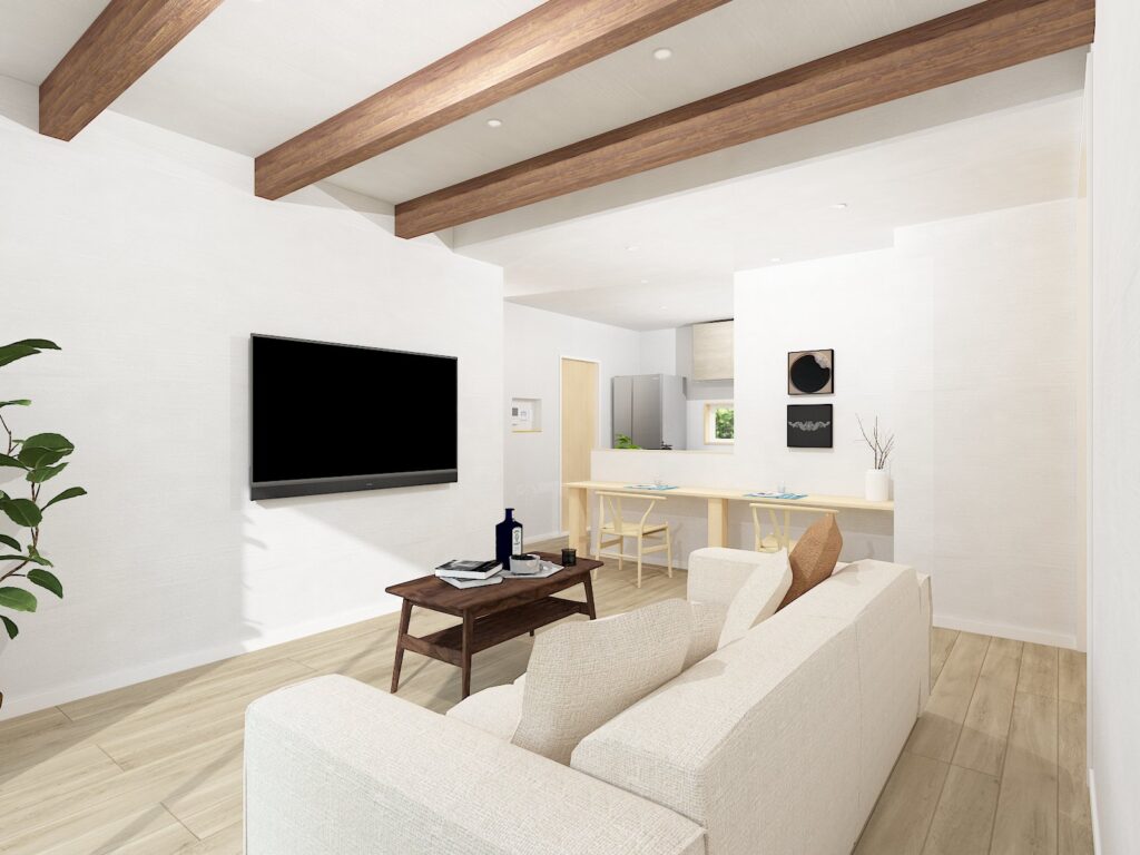 📌木の梁を見せた、落ち着きあるLDK|木のぬくもりに包まれたくつろぎ空間。