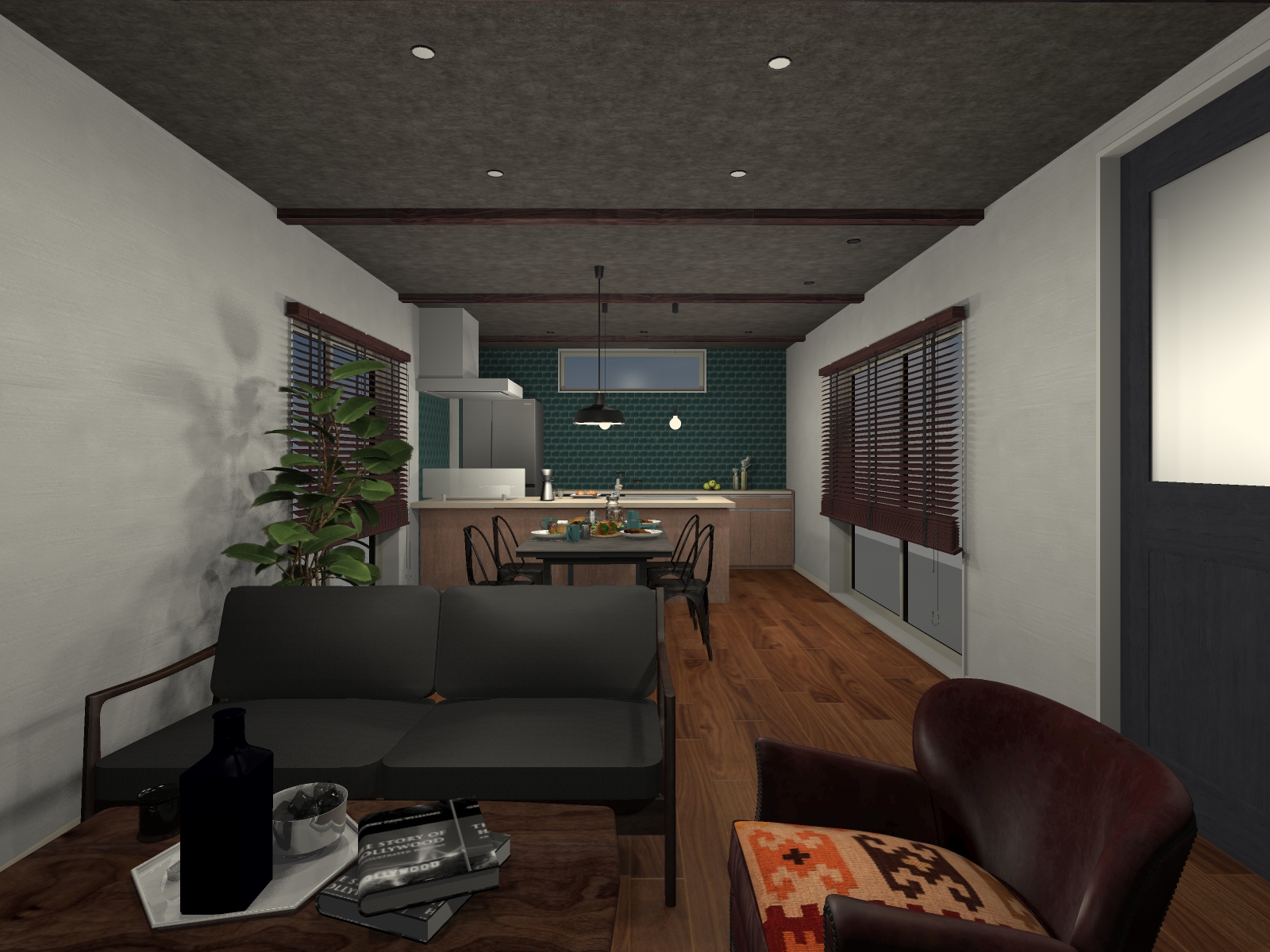📌リビング天井は梁現しとブラック系のクロス貼り。