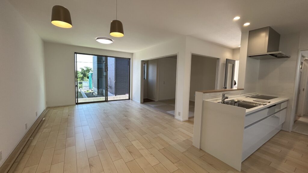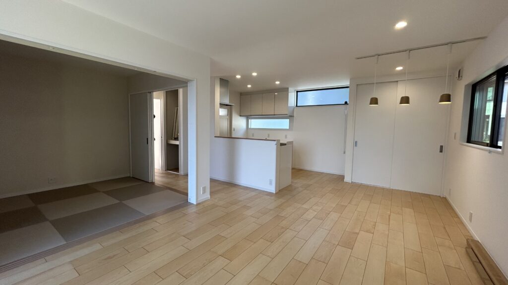 子どもが小さいのでキッチンから部屋全体を見渡せるようにし開放感のあるリビングにしました。