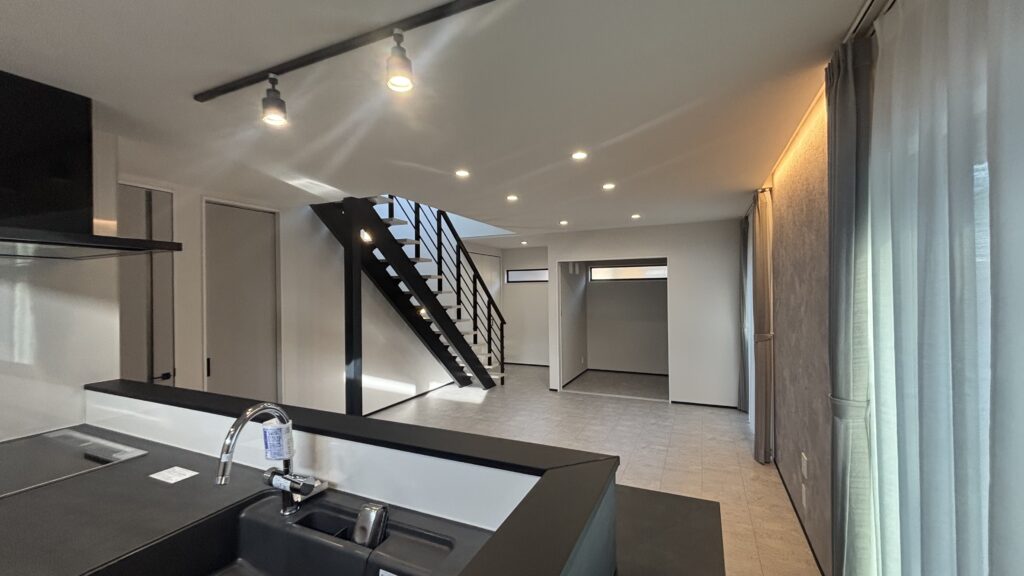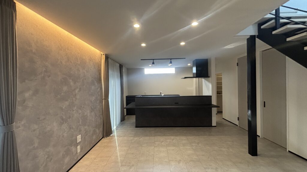 特にこだわった部分は、内装の色味です。一階は木目の無い、白・黒・グレーの3色でシンプルな色にしました。