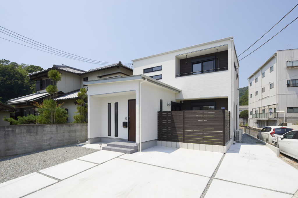 K様の希望だった、白を基調にしたスタイリッシュな外観。デッキは外回りを高い格子で覆っているので、道路や隣家との距離感が保たれており、子供たちが安全に伸び伸び遊ぶことができるという利点も。