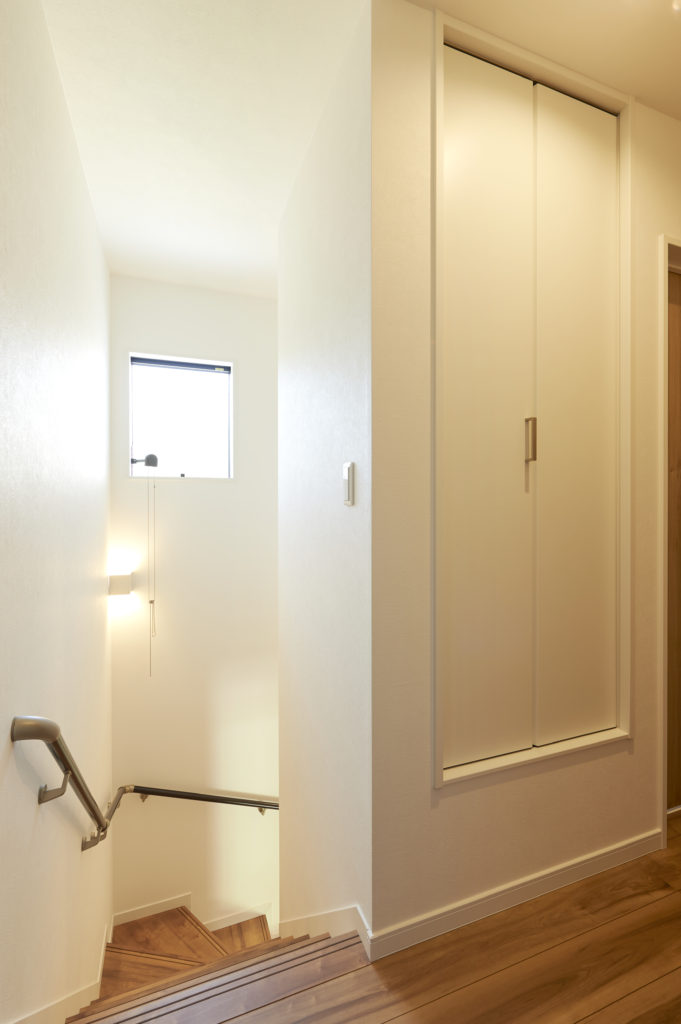 階段上のデッドスペースを有効活用して設けた、2階の踊り場の収納スペース