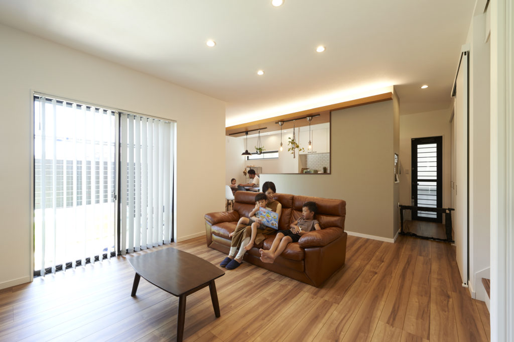 ダイニングとリビング、両方からのつながりをを持たせたデッキスペースを設けて、敷地面積は抑えながらも明るく開放的なLDKを実現。やりたい事が予算内に収まるように計画されたK様邸。