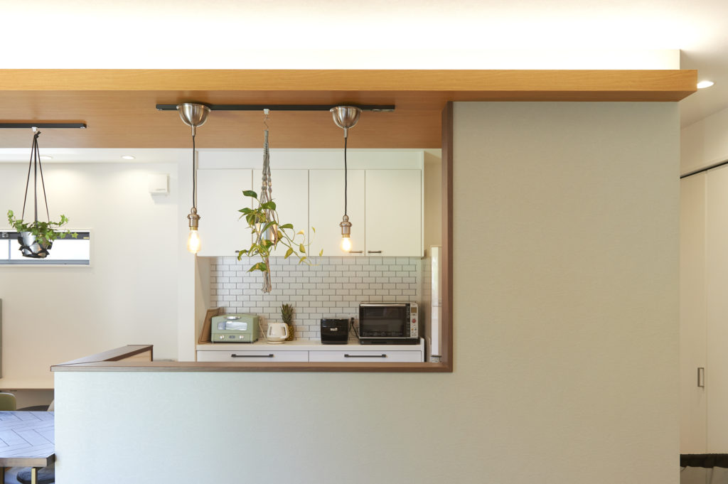 ペンダントライトのレールには観葉植物もつるしてキッチンカウンターをおしゃれに演出。日々のお手入れはご主人の担当