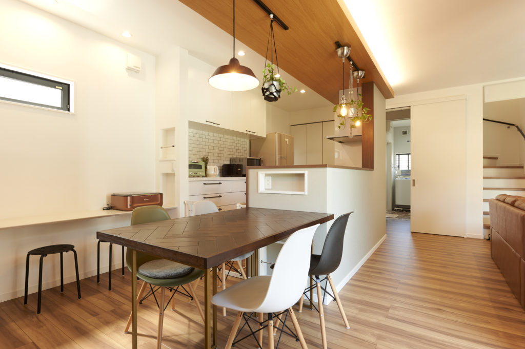 ダイニングテーブルはキッチンの横に置き、配膳など日々の動線もスムーズに。壁面には家族で多目的に使えるカウンターを造作