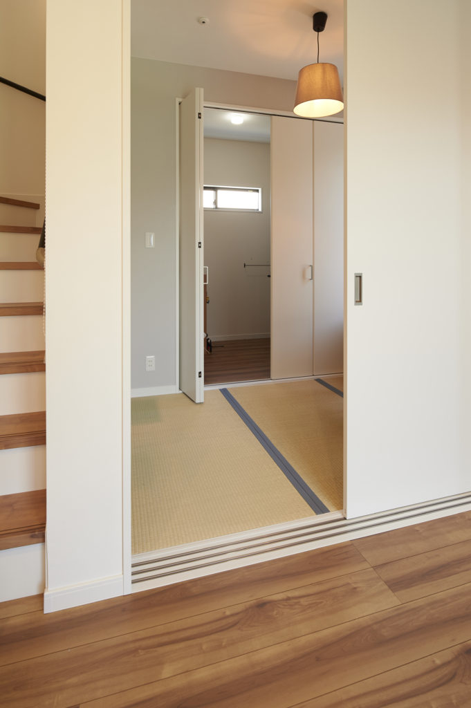 日々の洗濯と衣類の収納までの動線もお見事で、デッキで干した洗濯物を和室に取り込み、そこで衣類を畳んでそのまま隣のウォークインクロ―ゼットに収納できるスムーズな流れに。
