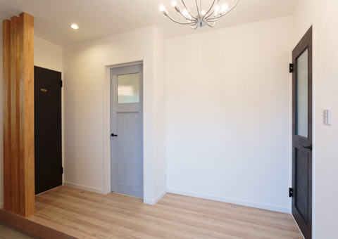 横長のゆったりとした玄関ホール。ヴィンテージ感のある可愛いブルーのドアの向こうがサロンになっている。