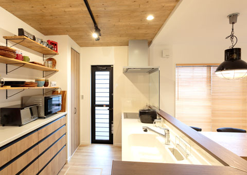 手元が隠れるよう立ち上がりを設けたカウンター。パントリーなど収納スペースも十分確保されている。