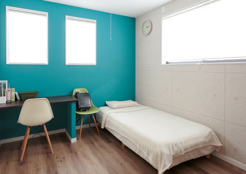 コンクリート風のクロスにターコイズブルーのアクセントクロス、ダークなフローリングで、息子さんの部屋は少し大人っぽい内装に。