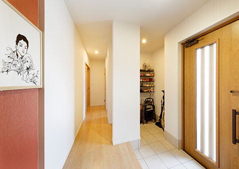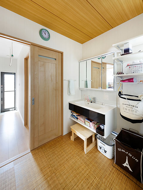 カウンター越しに家族が集まるダイニング・キッチンから、玄関ホール、水回り、洗濯物の内干しができる家事スペース、そしてまたダイニング・キッチンへと、ぐるっとつながる回遊動線が魅力のS邸は平屋プランで実現した住まいだ。